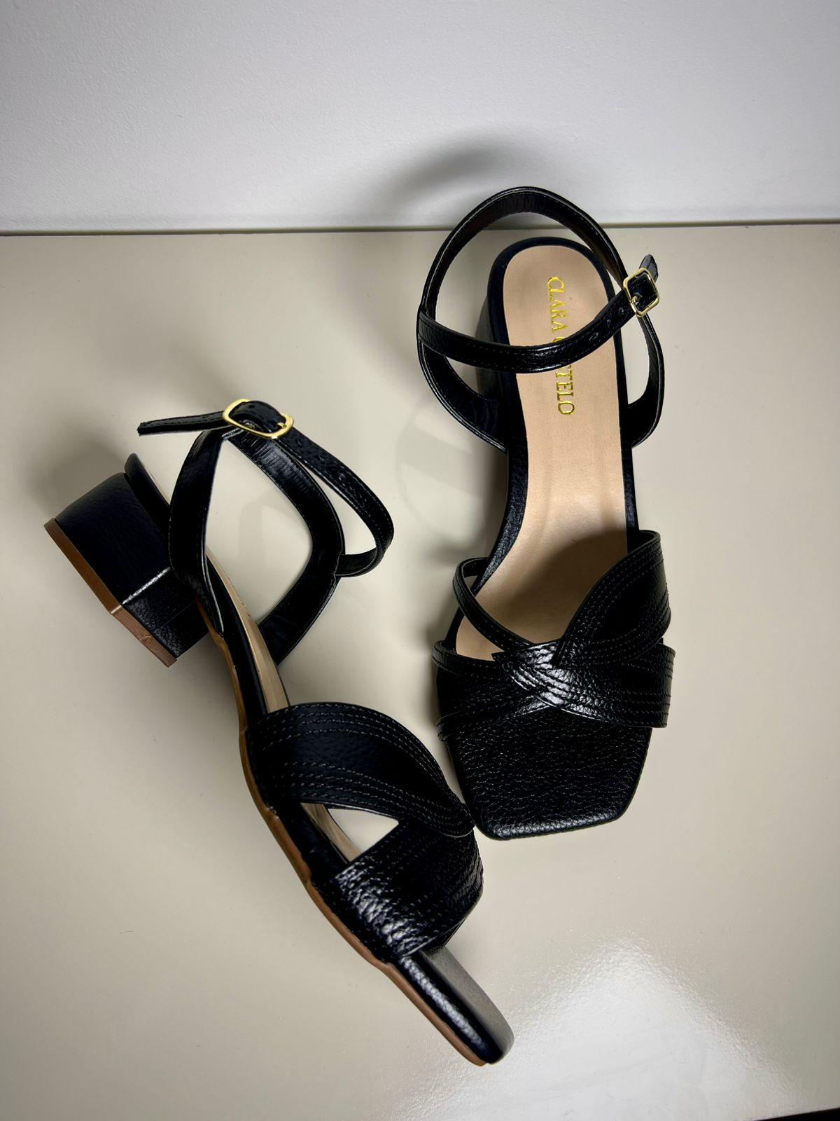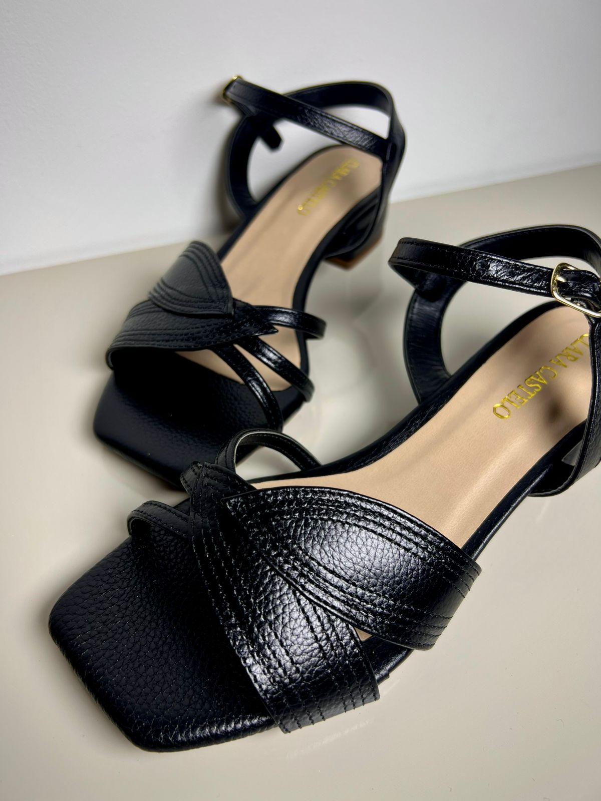 Sandália feminina em couro legítimo na cor preta, com design moderno em tiras estilo folha e salto bloco que garante conforto e estabilidade. Um modelo elegante e atemporal para compor looks sofisticados em qualquer ocasião.